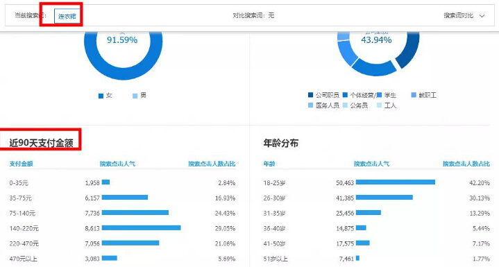 第二:选择的产品价格带要一致,因为价格带不同,人群就不同,那么当你一旦跨了价格带,就意味着你的店铺的人群就会有偏差,那么店铺接下去就会又回到死店的状态,所有一般我们是用搜索洞察去定价(之前的搜索人群画像)
