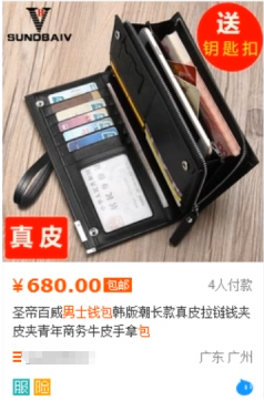 大家看这张图哪里不好,其实从现在各家淘宝主图设计对比的话整体图片美工设计并不是很好,但是哪里才是重点呢?就是这张图构图中的主图水印没有做好,首先看商品售价680元,在同类商品也算是中端以上了。主图上只有“真皮”和“送钥匙扣”两个水印,作为一个中高端买家你会不会去点击这个商品看详情呢?中高端买家有一定购买力更看重的是这这件商品是不是适合自己,不会因为一个钥匙扣去买。卖家没有定位好自己的精准客户人群,营销思路就是错的。